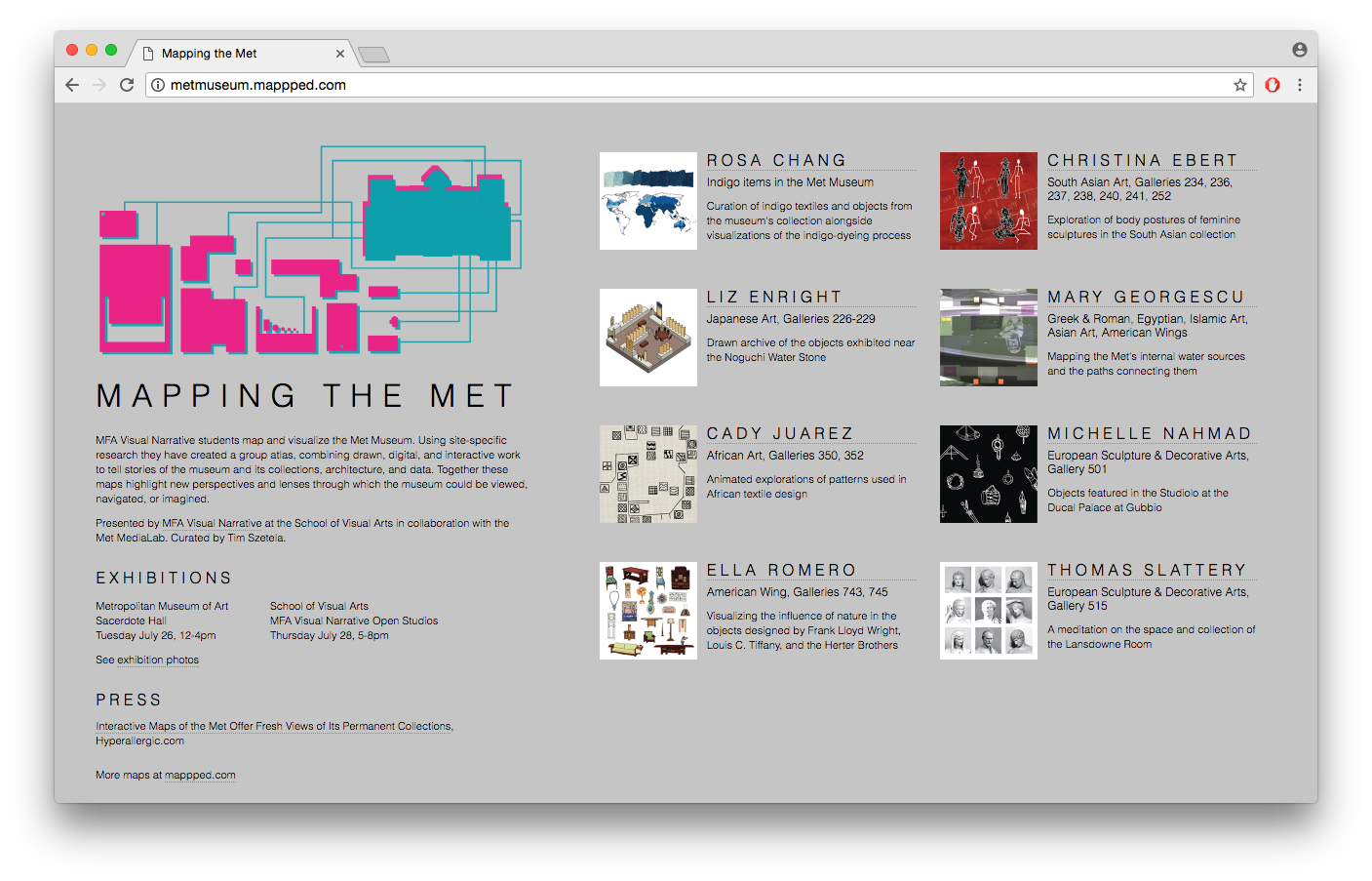 MFA Visual Narrative students map and visualize the Met Museum. Using site-specific research they have created a group atlas, combining drawn, digital, and interactive work to tell stories of the museum and its collections, architecture, and data. Together these maps highlight new perspectives and lenses through which the museum could be viewed, navigated, or imagined.